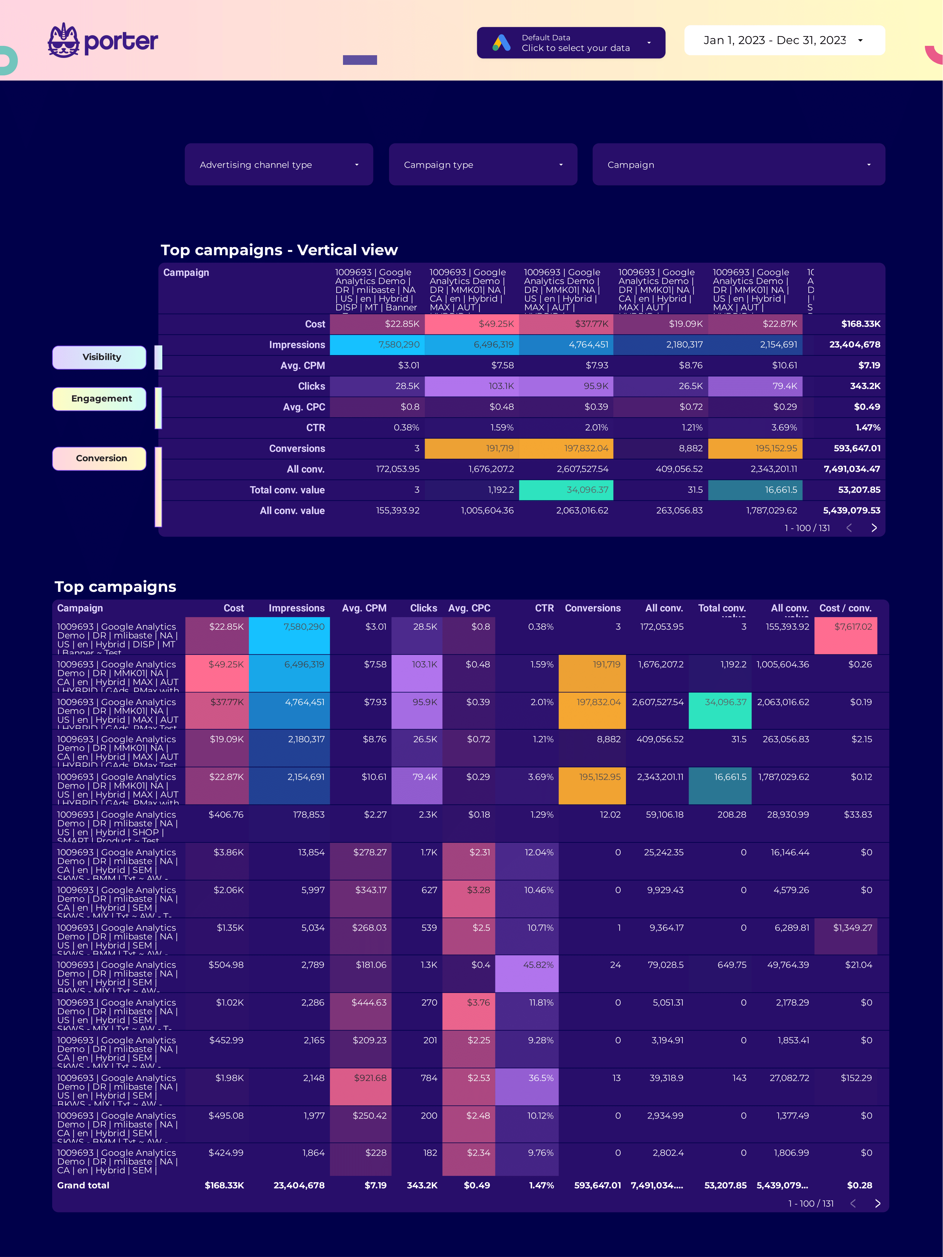 Para conectar tus fuentes de datos, ve a portermetrics.com, elige las fuentes de datos para llevar a tu informe.